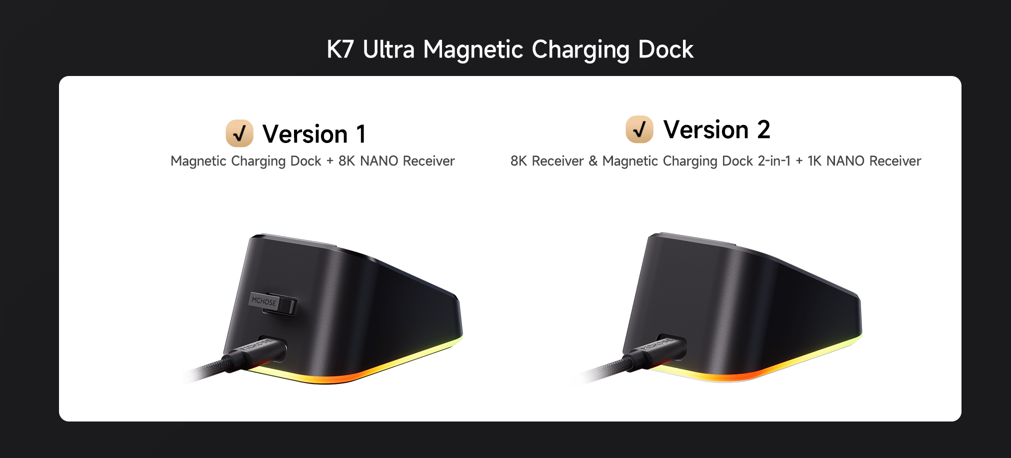 | Package Contents | 1× K7 Ultra Mouse, 1× Magnetic Charging Dock, 1× 8K Receiver, 1× Charging/Data Cable, 1× User Manual, 1× Anti-slip Sticker, 1× Custom Mouse Storage Bag | 1× K7 Ultra Mouse, 8K Receiver & Magnetic Charging Dock 2-in-1, 1× 1K Receiver, 1× Charging/Data Cable, 1× User Manual, 1× Anti-slip Sticker, 1× Custom Mouse Storage Bag | |||