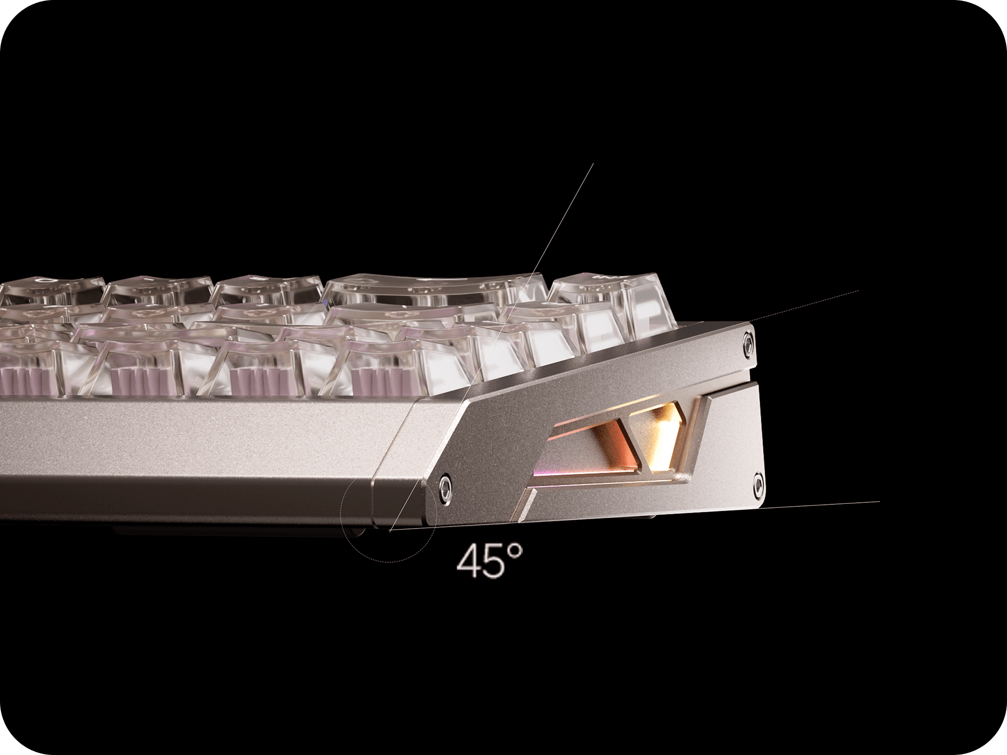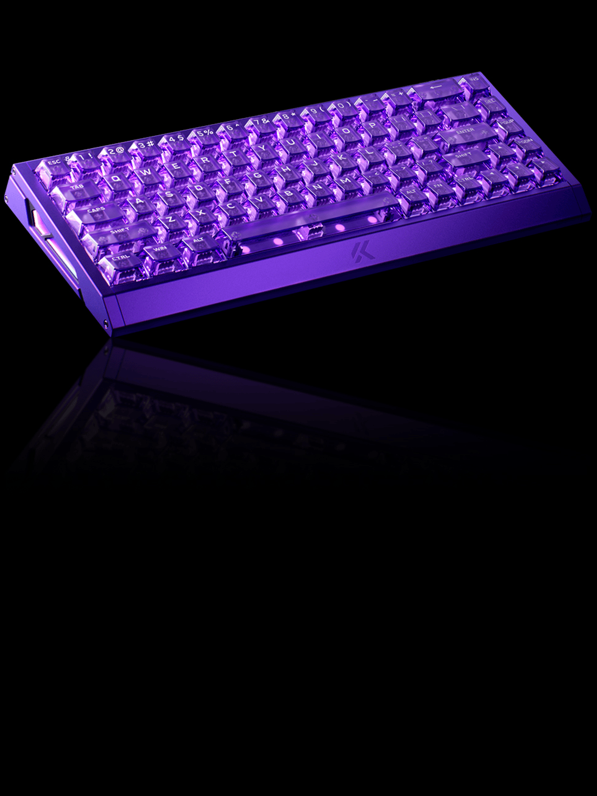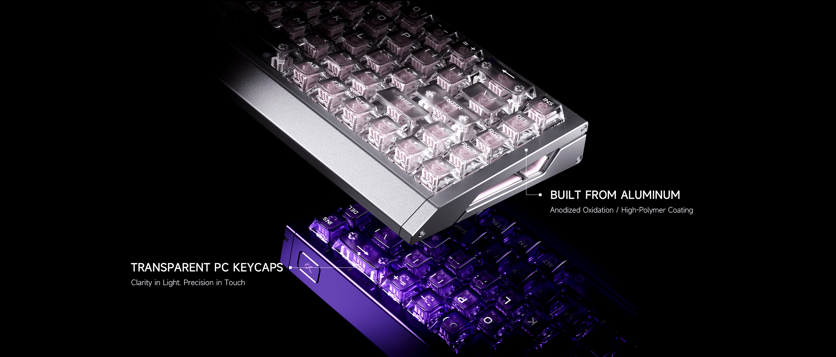 The CNC aluminum body, finished with anodization and a high-polymer coating, pairs clean lines and solid structure with transparent PC keycaps that let light flow through—creating a refined, durable build with depth, subtle illumination, and a precise, elevated typing experience.