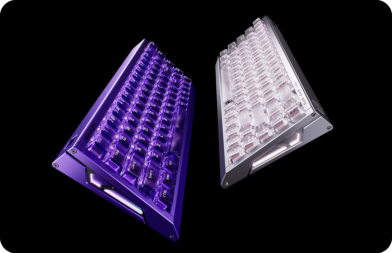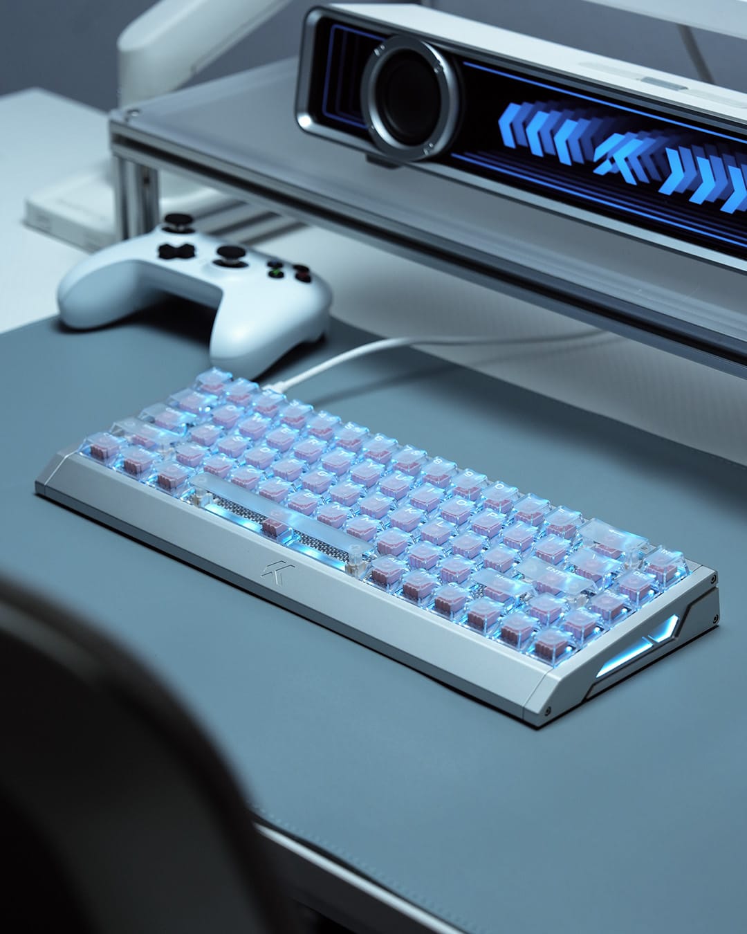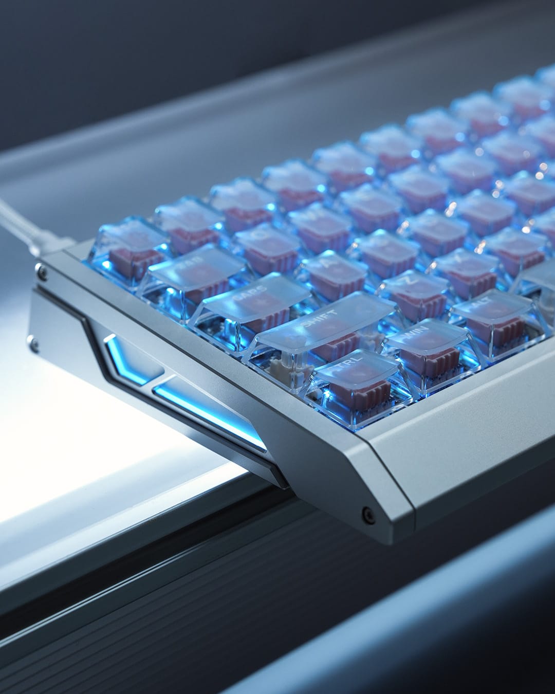 The CNC aluminum body, finished with anodization and a high-polymer coating, pairs clean lines and solid structure with transparent PC keycaps that let light flow through—creating a refined, durable build with depth, subtle illumination, and a precise, elevated typing experience.