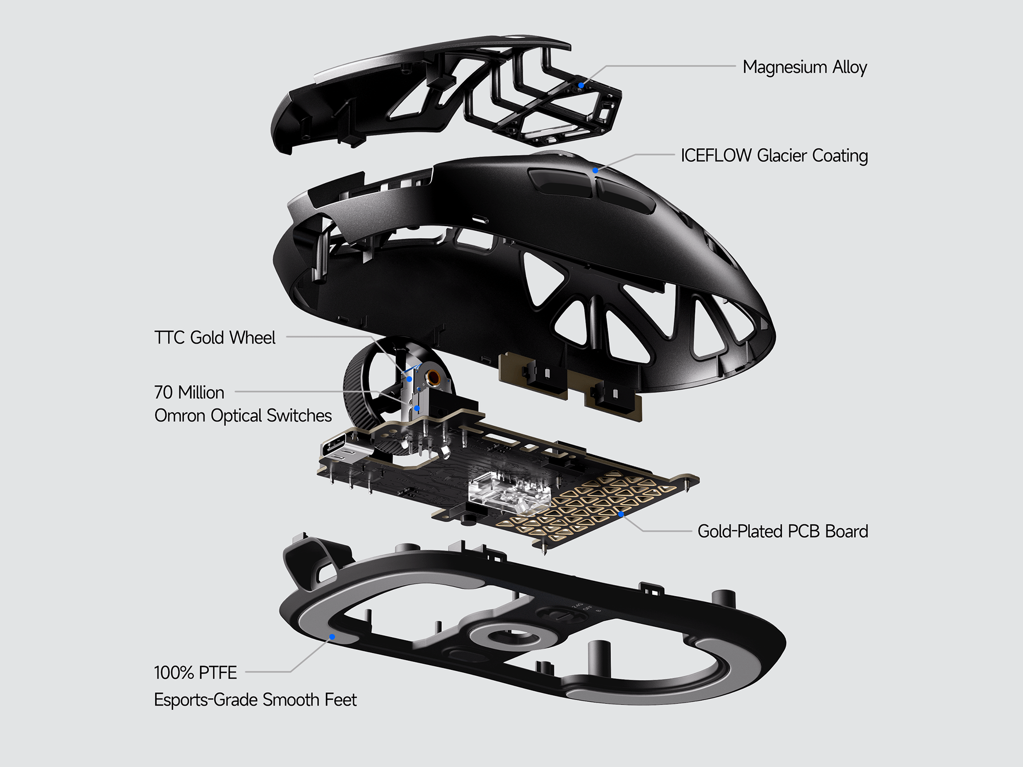 Omron Optical Switches rated for 70M clicks deliver reliable, precise performance, paired with a TTC Gold Encoder for smooth and durable scrolling.