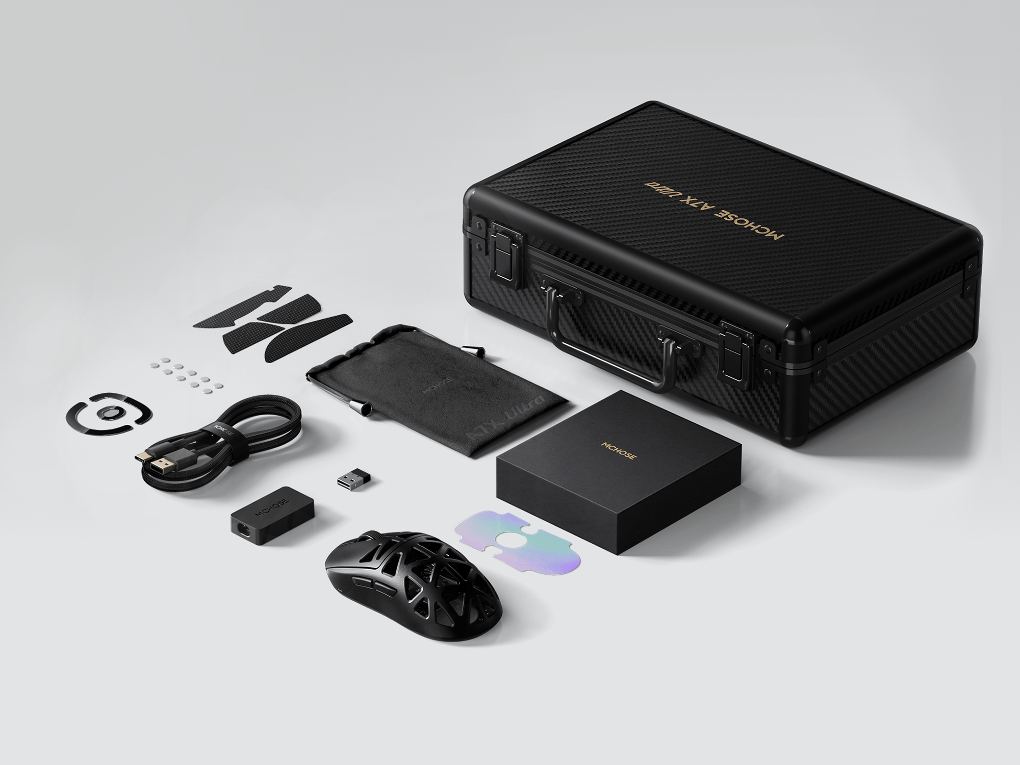 High-grade sturdy case, custom laser-etched bottom plate, glass skates, mouse pouch, and included 8K accelerator—more than a mouse, a collector-grade esports tool.
