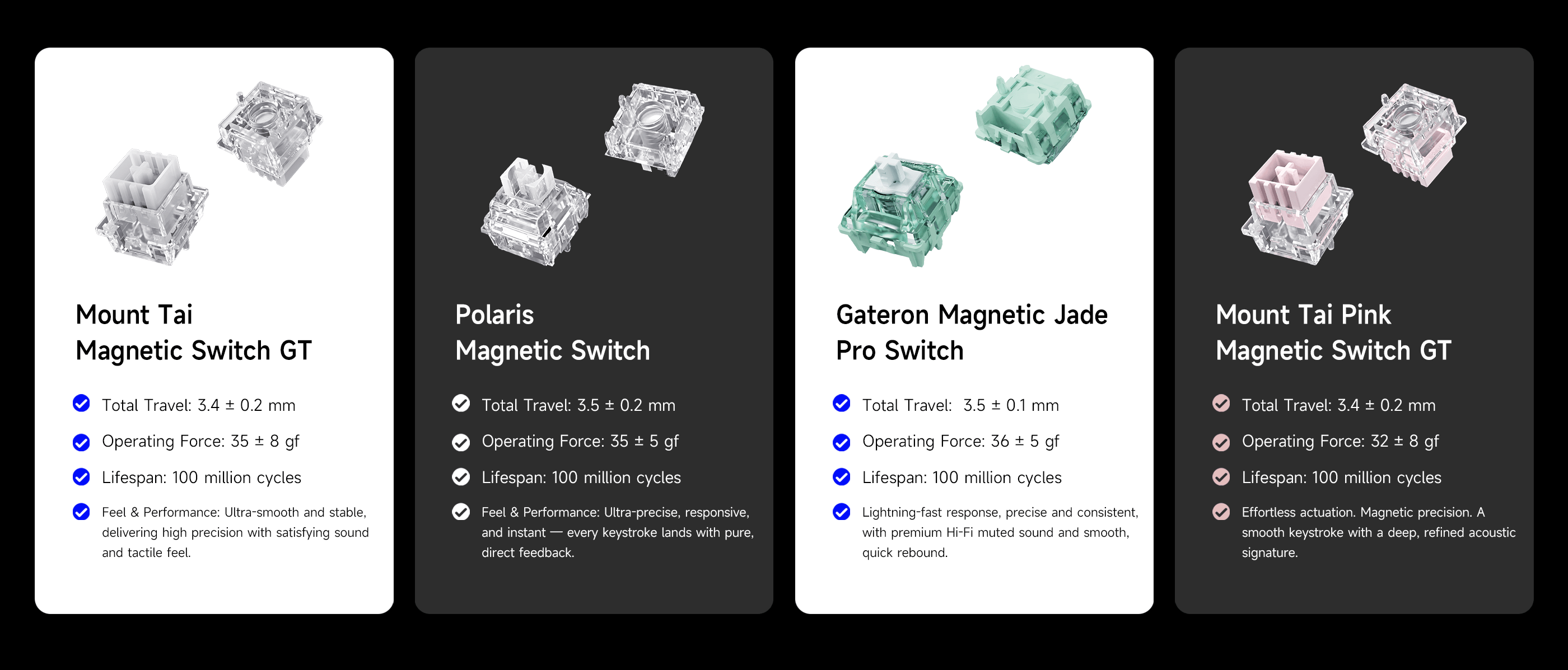 - Switches : Polaris Magnetic (8k) / Gateron Magnetic Jade Pro Switch (8k) / Mount Tai Magnetic GT Switch (16k) / Mount Tai Pink Magnetic Switch GT (16k)