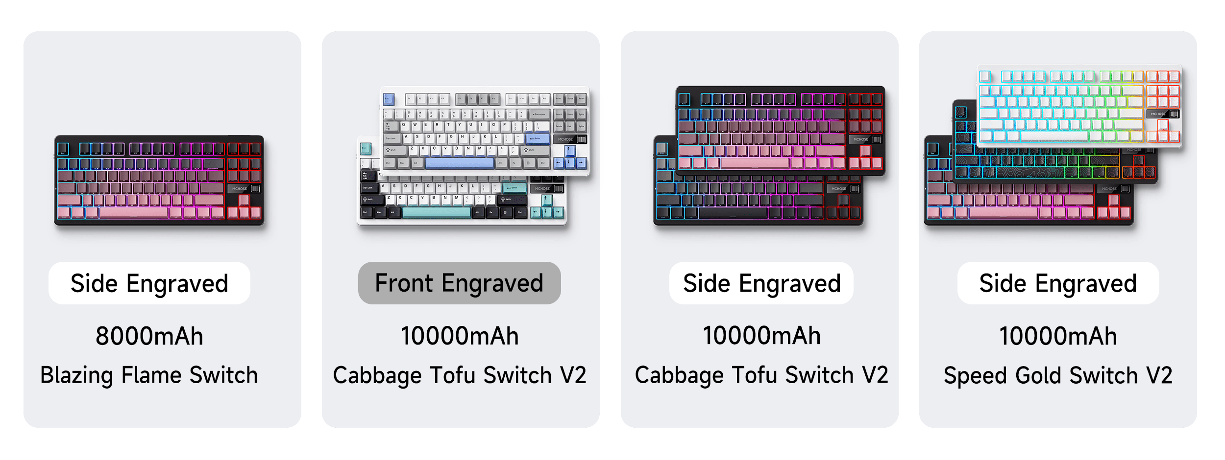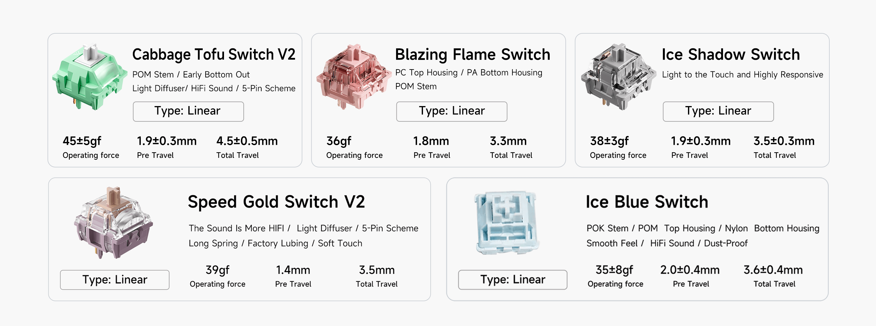 - Switches Options: Blazing Flame Switch | Ice Shadow Switch | Cabbage Tofu Switch V2 | Speed Gold Switch V2 | Ice Blue Switch | Matcha Latte Switch V2