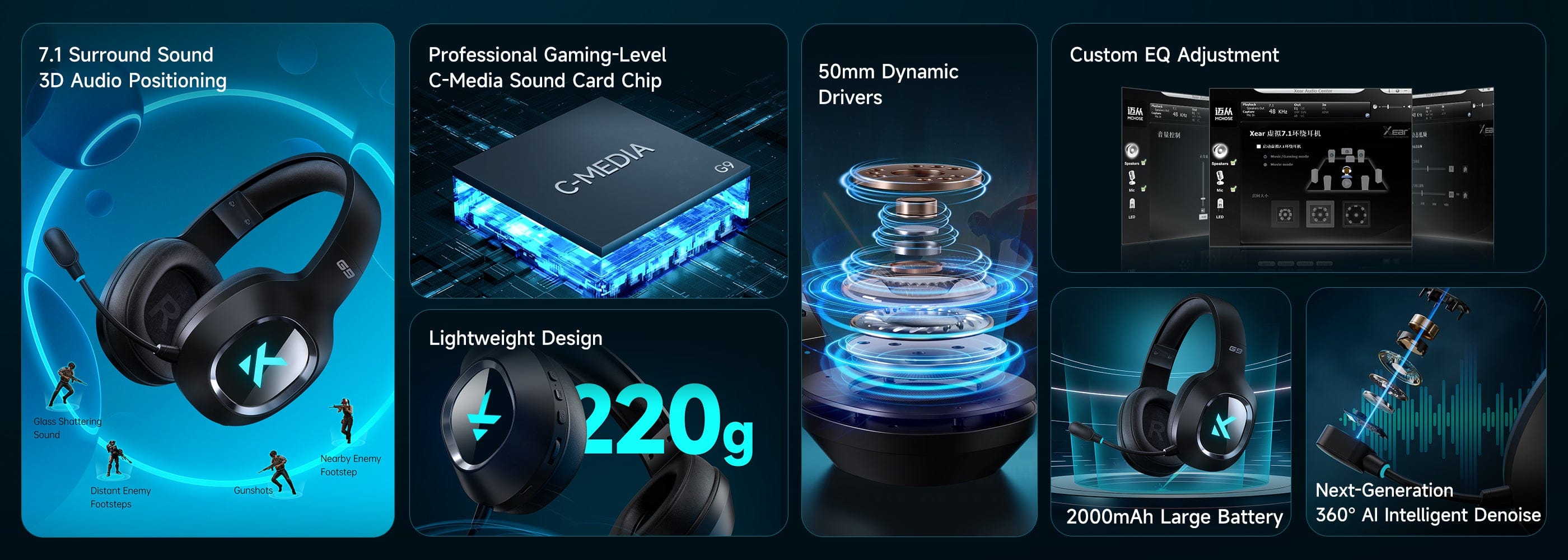 Equipped with powerful 50mm full-range dynamic drivers and advanced 7.1 virtual surround sound technology, the MCHOSE G9 provides Hi-Res audio quality. You can hear every detail with crystal-clear highs, robust mid-tones, and deep bass for an unparalleled audio experience.