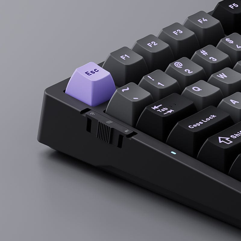 The minimalist hidden magnetic side plate elegantly houses an integrated 2.4GHz receiver, offering both convenient storage and easy access. This design seamlessly blends style with functionality. This keyboard offers three convenient options on the left top for smooth transitions between wireless, BT, and wired connections.
