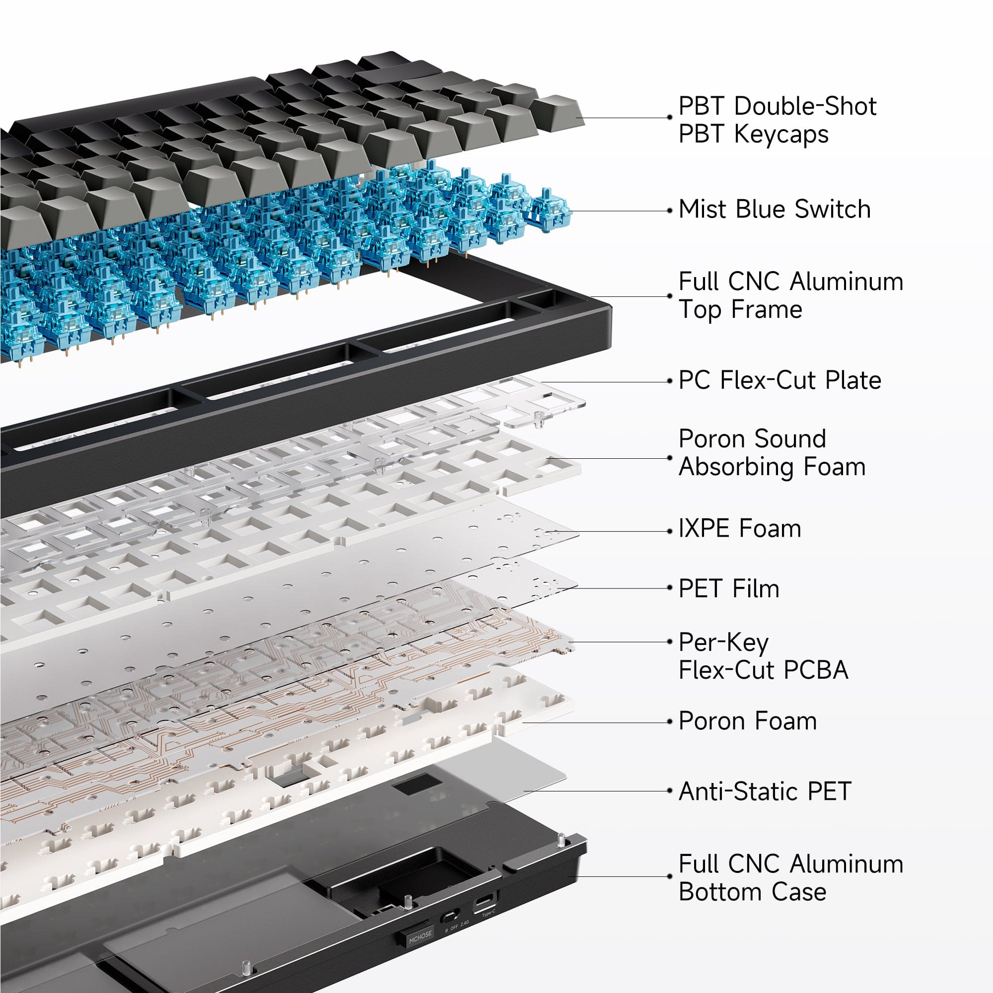 Feel the elegance at your fingertips. The Full CNC Aluminum top case with anodized finishing, premium texture that is both durable and luxurious. A keyboard that not only performs flawlessly but also elevates your setup with its refined aesthetics.