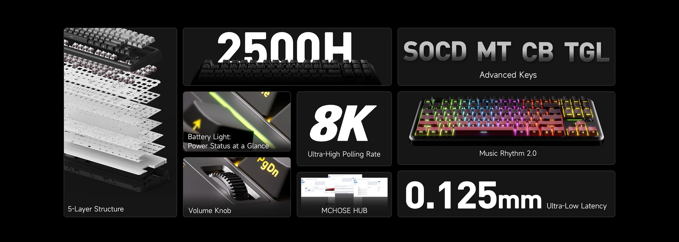 Experience 0.125ms ultra-low latency with dual 8K polling rate in wired and 2.4G wireless modes. Every keystroke is precise, smooth, and instantly recognized — perfect for competitive gaming and high-speed workflows