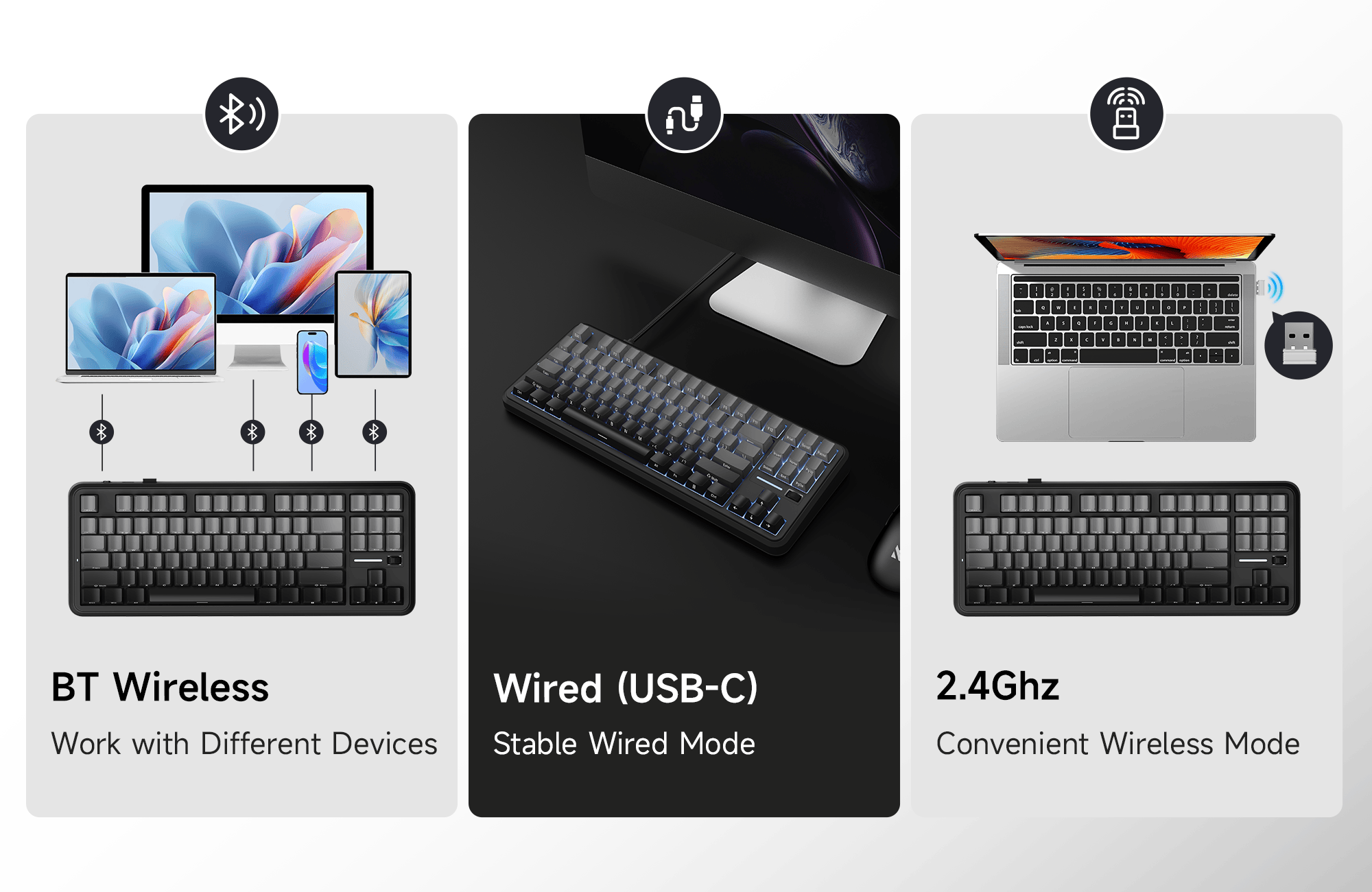 Seamlessly connect via Type-C wired, 2.4G wireless, or BT wireless. Switch effortlessly between multiple devices. Supported by the driver for custom key settings and macro recording, compatible with Windows and macOS.