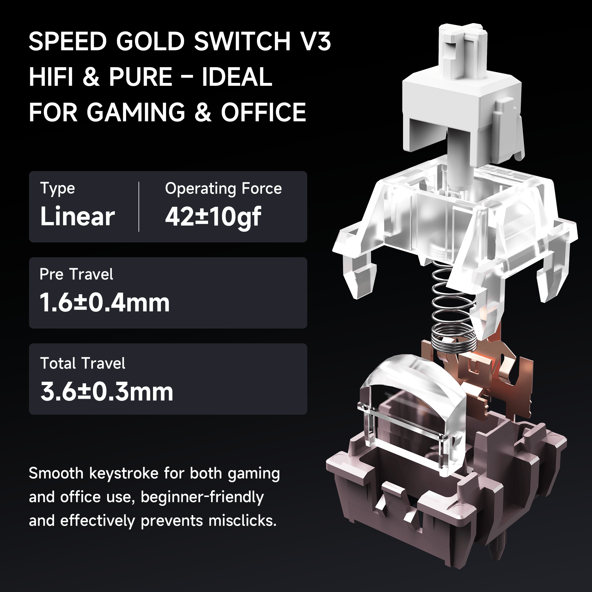 Linear type, 42gf±10gf operating force, 1.6mm±0.4mm pre-travel, 3.6mm±0.3mm total travel. Smooth, tactile, and responsive keystrokes with crisp, focused sound for gaming and office use. Beginner-friendly and reduces misclicks.
