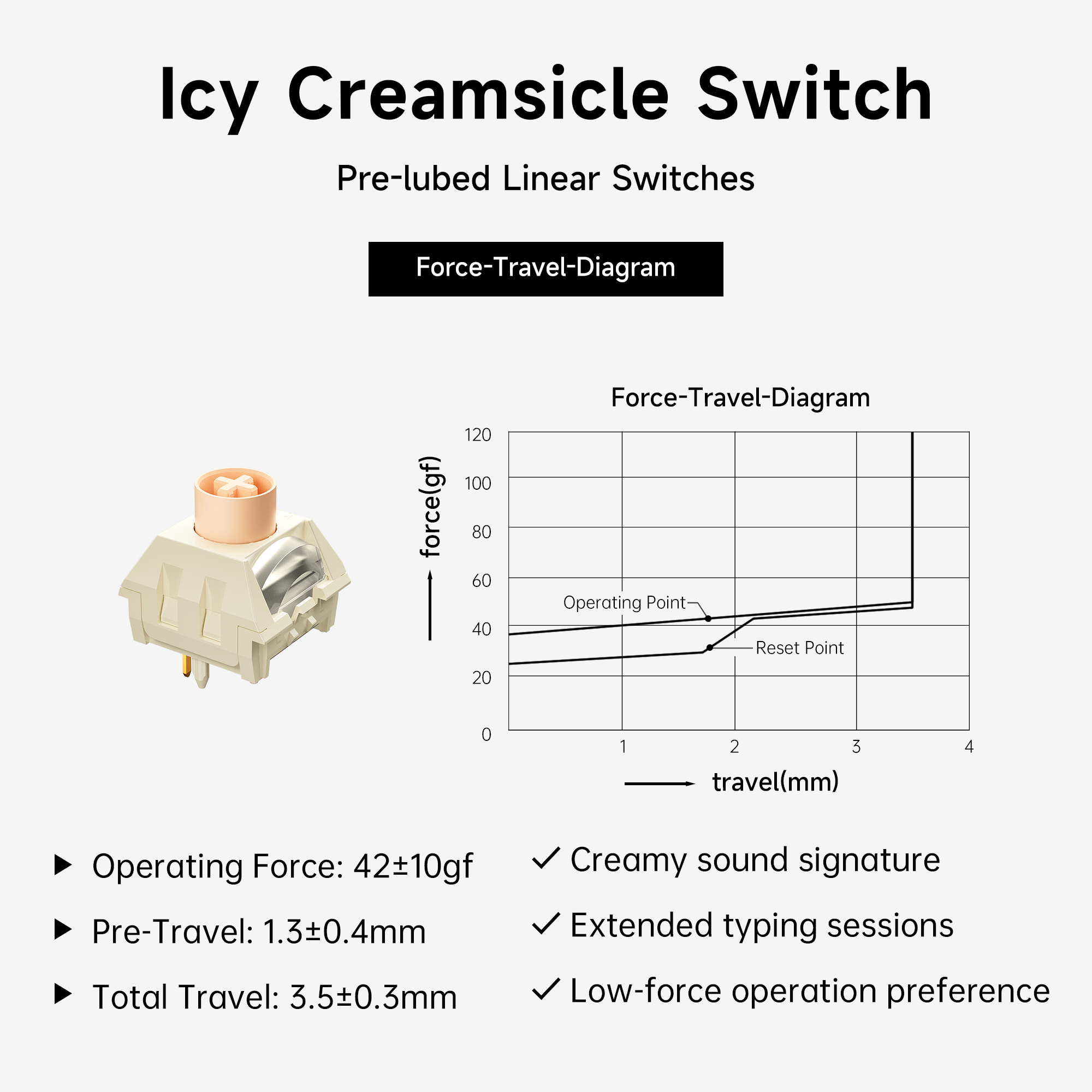 Experience effortless keystrokes with a soft, silky-smooth feel and a satisfyingly gentle thock. Designed for both comfort and performance, this switch features a BOX structure with a light diffuser, gold-plated spring, and pre-press mechanism for ultra-smooth actuation. It’s dustproof, waterproof, and built to last—perfect for long typing sessions or anyone who prefers low-force.