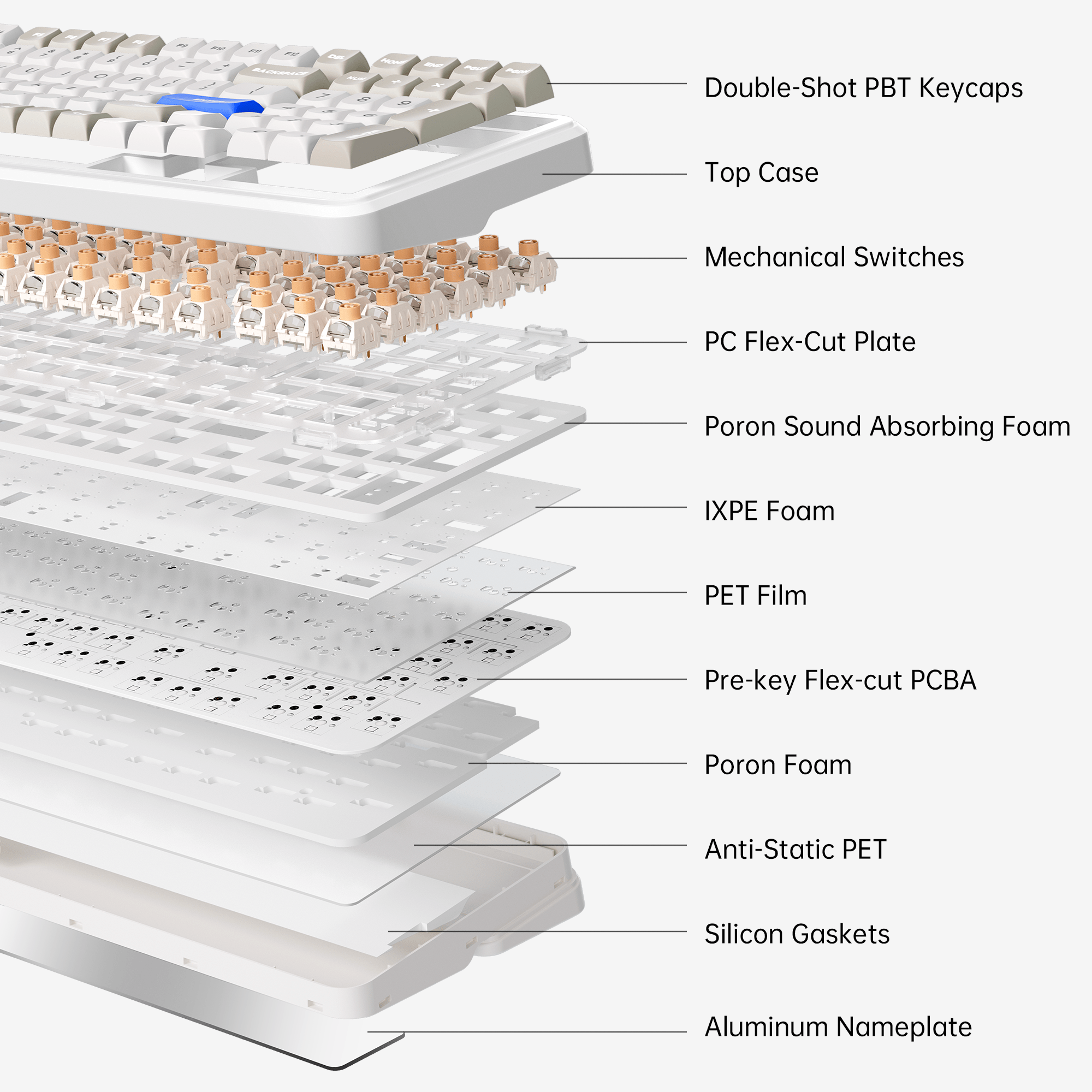 The K99 V2 features a refined 6-layer gasket-mounted structure that delivers superior shock absorption and consistent keystrokes. The combination of sound-absorbing poron foam, IXPE foam, PET film, poron foam, anti-static PET and silicone gaskets effectively reduces noise and enhances acoustic clarity. Enjoy low-pitched, clear typing with smooth feedback on every press.