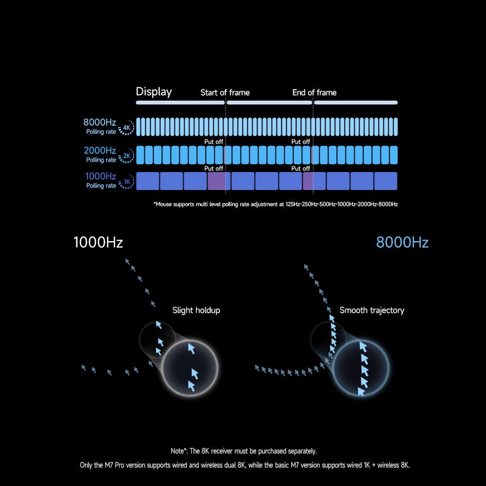 The M7 model features wired 1K and wireless 8K connectivity, while the M7 Pro includes dual-mode 8K options. This lightning-fast polling rate of just 0.125ms drastically reduces latency, providing enhanced precision and control during competitive gameplay.