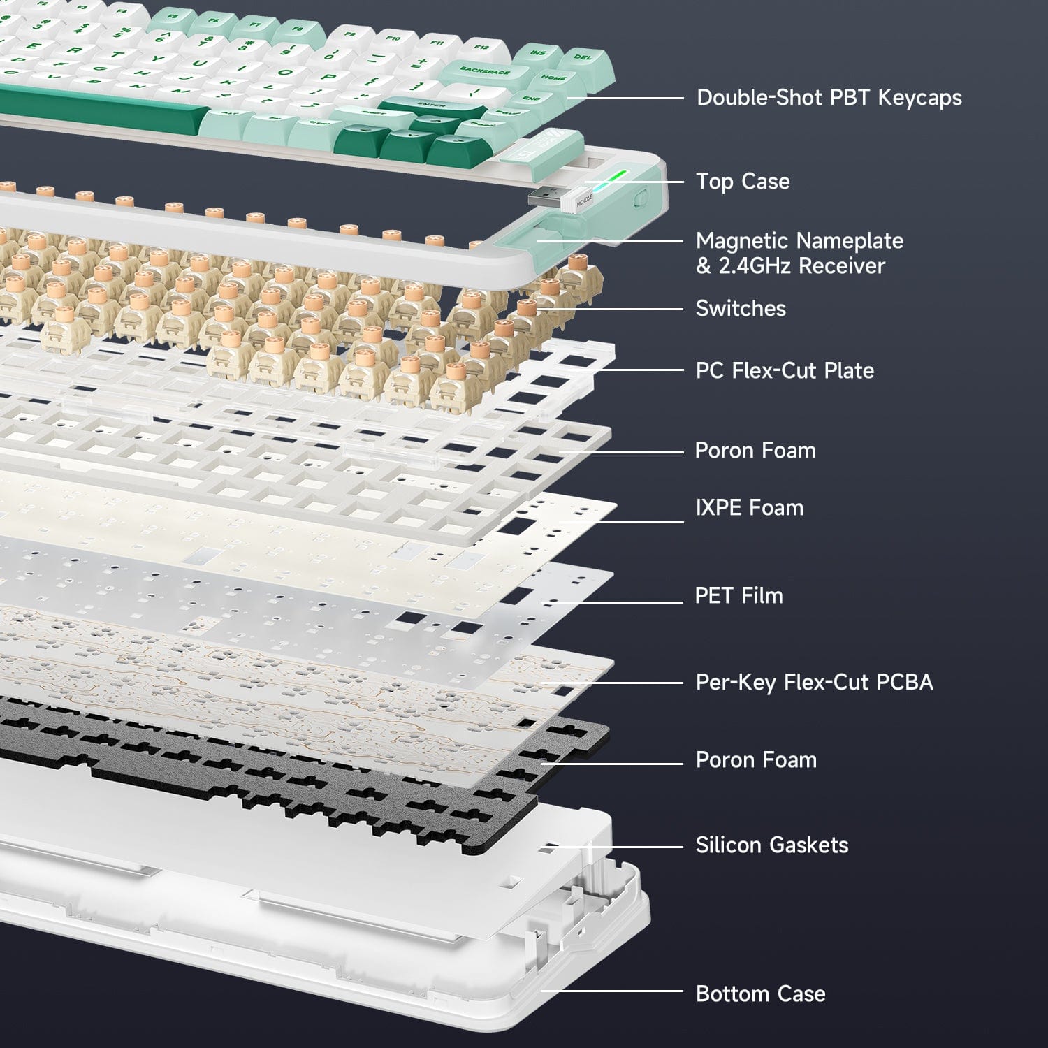 Effectively reduces vibrations with a balanced soft-hard feel. The enhanced structure minimizes resonance, reduces cavity noise and hand vibrations, offering a soft, yet firm and focused typing experience with pure and clean keystroke sounds.